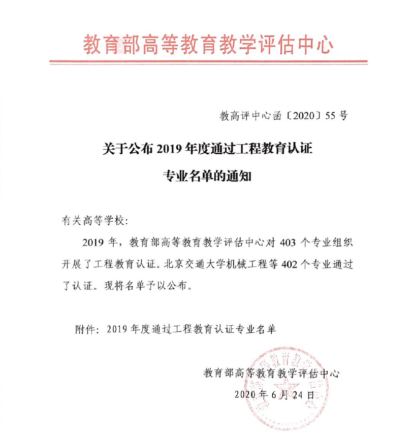 近日,教育部高等公司产品评估中心、中国工程教育专业认证协会正式发布了《关于公布2019年度通过工程教育认证专业名单的通知》(教高评中心〔2020〕55号)和《关于公布北京交通大学机械工程等402个专业认证结论的通知》(工认协〔2020〕15号)。公司材料成型及控制工程专业通过全国工程教育专业认证,有效期6年。