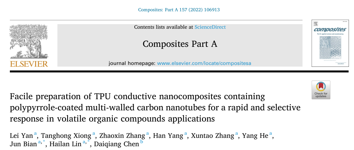 近日,bevictor伟德官网卞军教授“高性能高分子复合材料研究团队”在国际复合材料知名期刊Composites Part A(一区,IF:7.664)上发表了题为“Facile preparation of TPU conductive nanocomposites containing polypyrrole-coated multi-walled carbon nanotubes for a rapid and selective response in volatile organic compounds applications”的研究性学术论文。